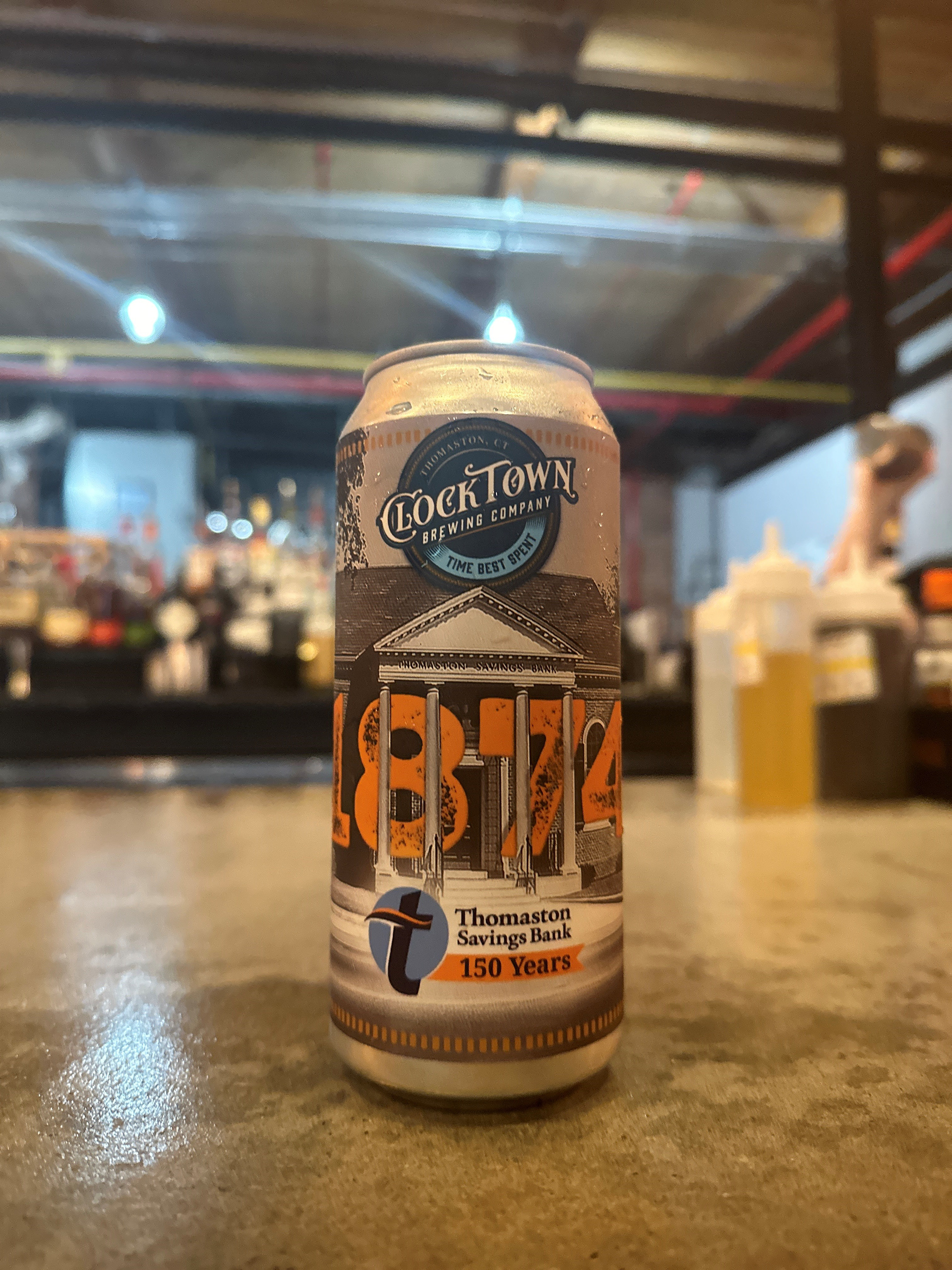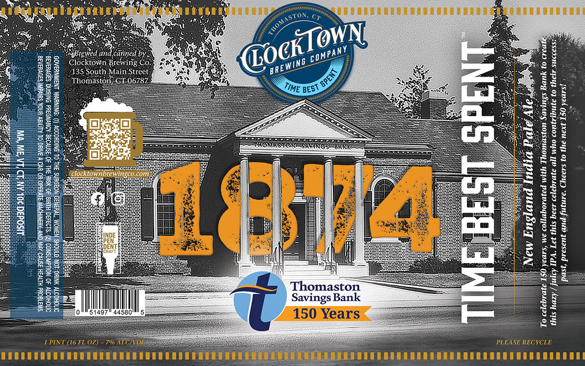 Co-branded beer can design between community bank and Clocktown Brewing Company.